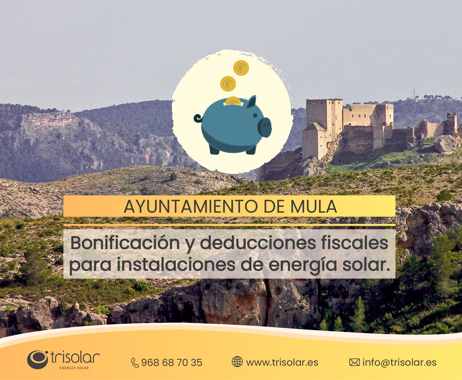 El Ayuntamiento de Mula bonifica con un 50% de la cuota íntegra del impuesto a las viviendas que hayan instalado sistemas para el aprovechamiento térmico y/o fotovoltaicos. Dicha bonificación estará vigente durante los 3 años siguientes a la instalación del equipo solar en su vivienda.